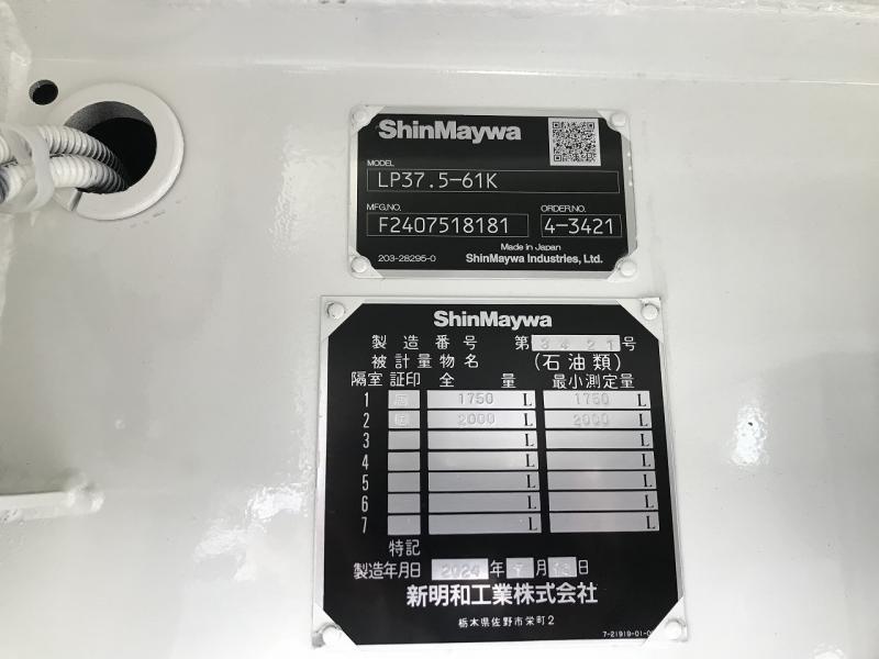 | 備考 | タンクローリー(新明和LP37.5-61K) 3.75KL 2室(2+1.75) ノズル 自動ホースリール デジタル流量計 4WD リヤフェンダー 消火器BOX ステンレス製 スコップかけ 脚立かけ付き 消防書類有 |
