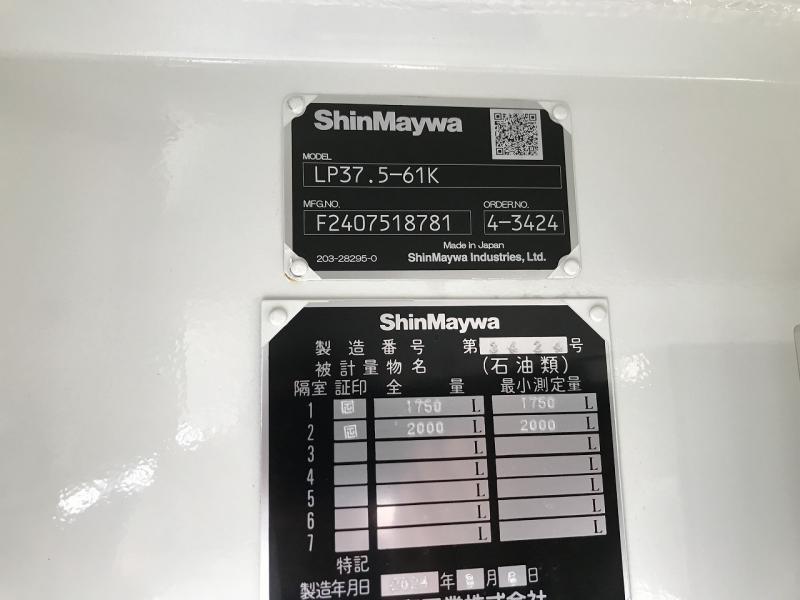 | 備考 | タンクローリー(新明和LP37.5-61K) 3.75KL 2室(2+1.75)ノズル 自動ホースリール デジタル流量計 4WD リヤフェンダー 消火器BOXステンレス製 スコップかけ 脚立かけ付き 消防書類有 |